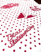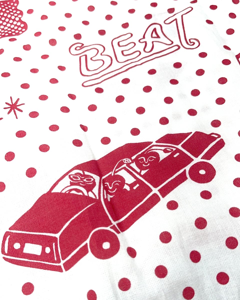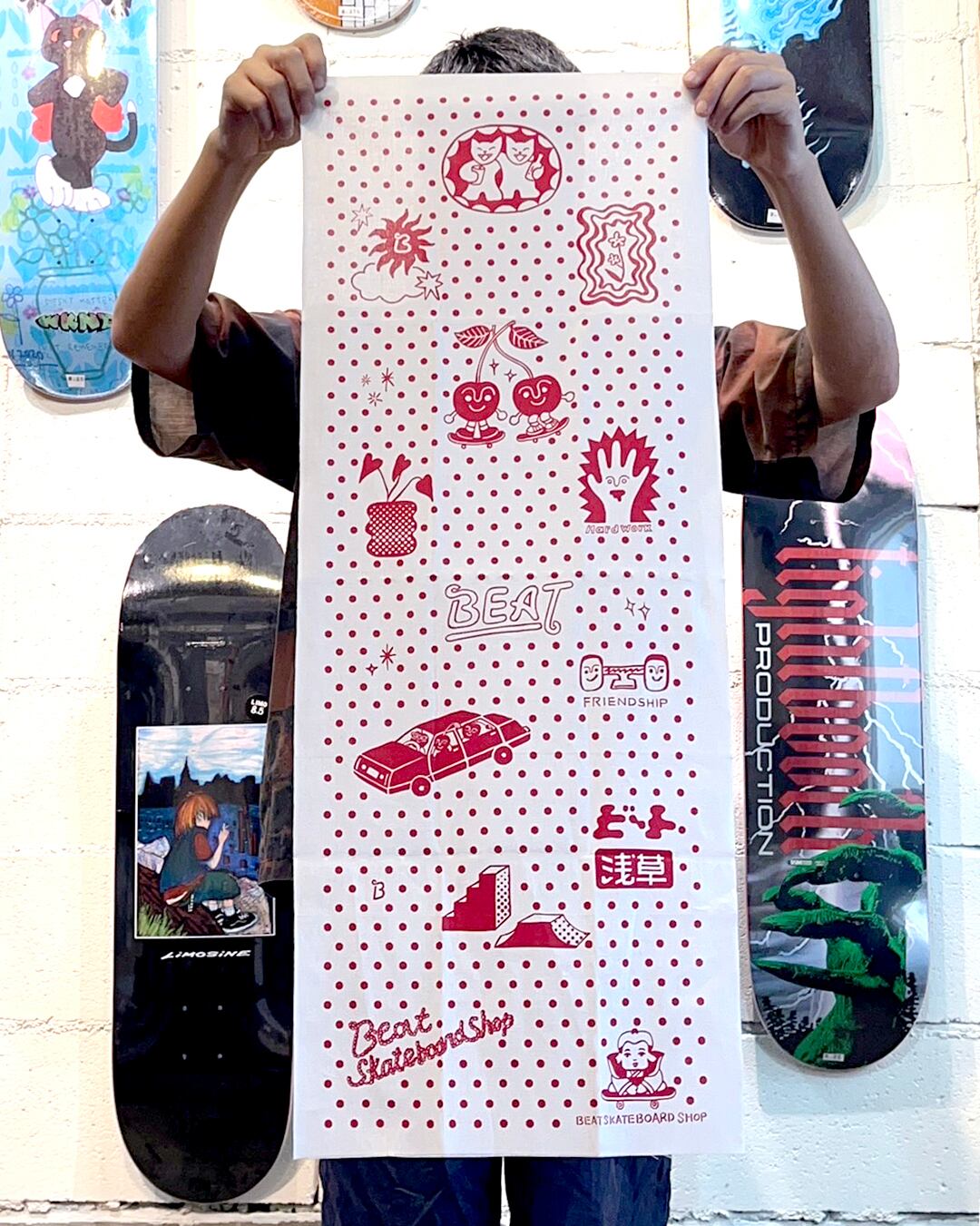 いろいろ描いてある賑やかな手ぬぐいとなっております。